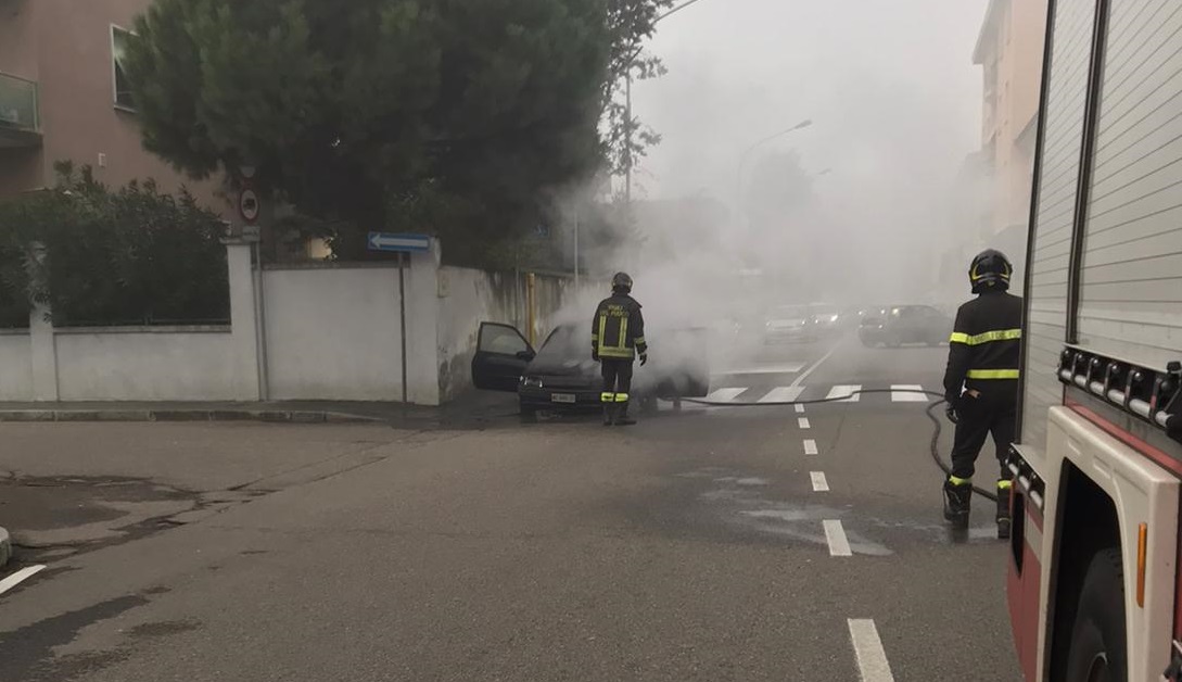 Auto in fiamme in via Carducci a Legnano. La donna che era al volante della vettura è stata messa in salvo.