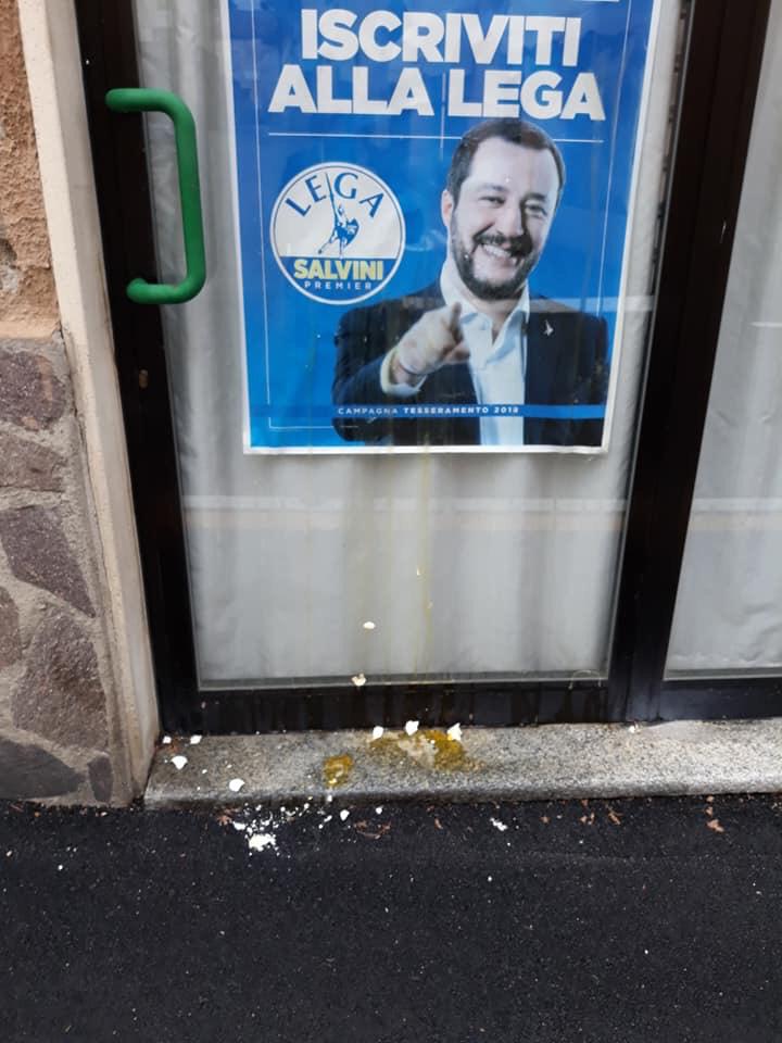 Atto vandalico ai danni della sede della Lega di Vedano Olona, al civico 1 di via dei Martiri. E’ successo venerdì 6 settembre 2019, quando ignoti hanno lanciato uova contro un manifesto del leader del Carroccio Matteo Salvini esposto sulla vetrina. Un poster realizzato per promuovere la campagna di tesseramento al partito, sul quale l’ex vicepremier campeggia sorridente.