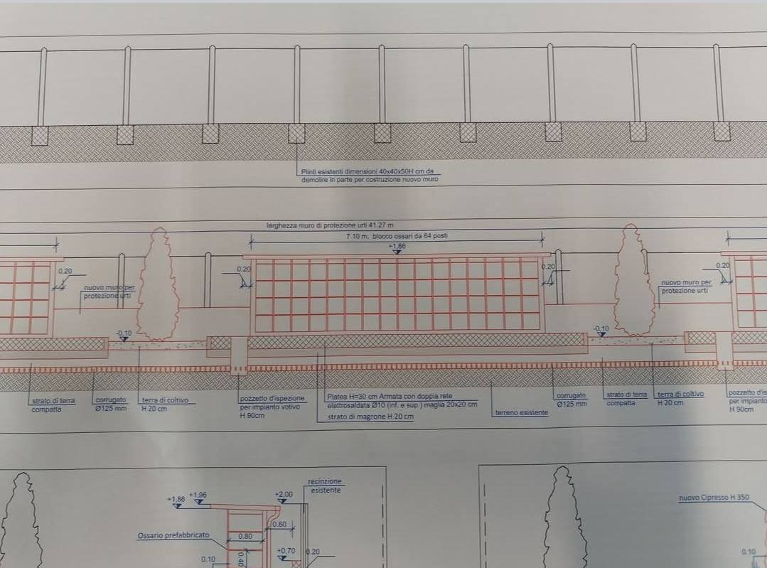 «All’interno dei tre blocchi le celle saranno disposte su quattro file. Le lastre avranno dimensione di 40 per 40 centimetri. L’altezza di ciascuno blocco, contenuta in complessivi 194 cm, renderà accessibili i loculi senza l’uso di scale. Inoltre tra un blocco e l’altro verranno posati dei cipressi, uguali a quelli esistenti nel campo vicino», spiega il sindaco Marco Re.
