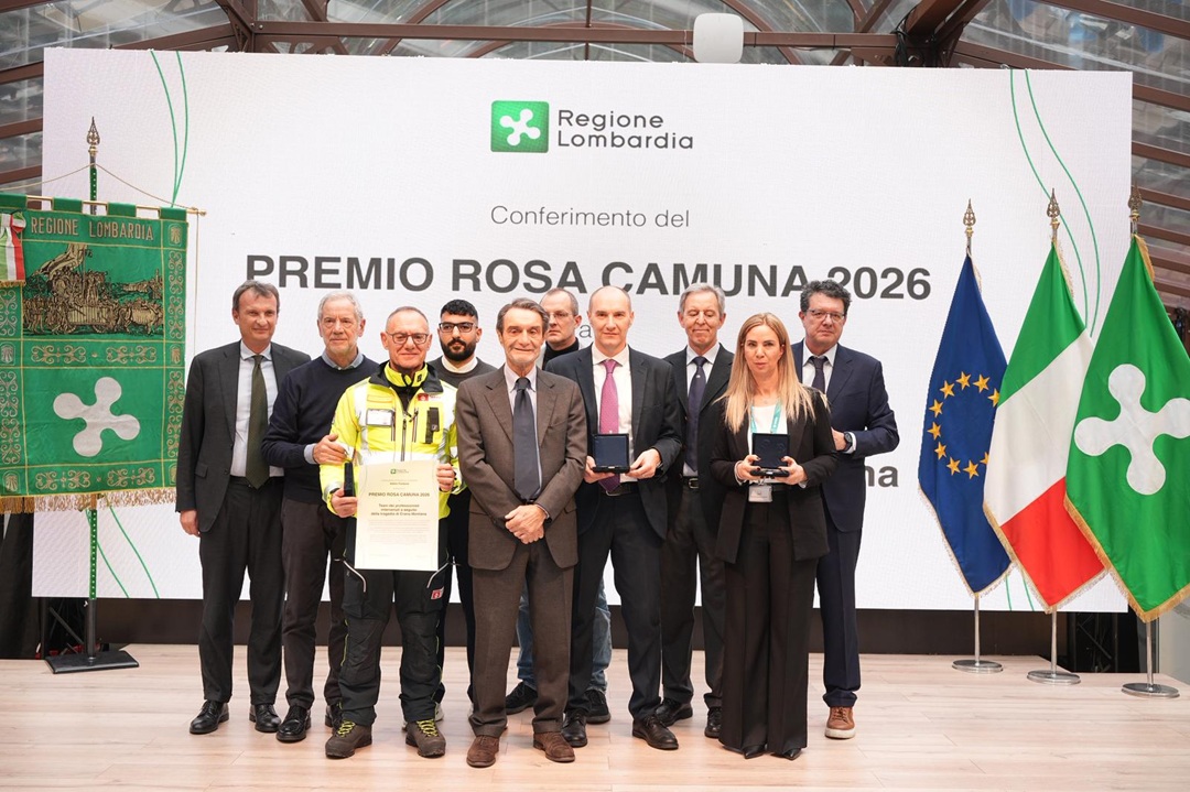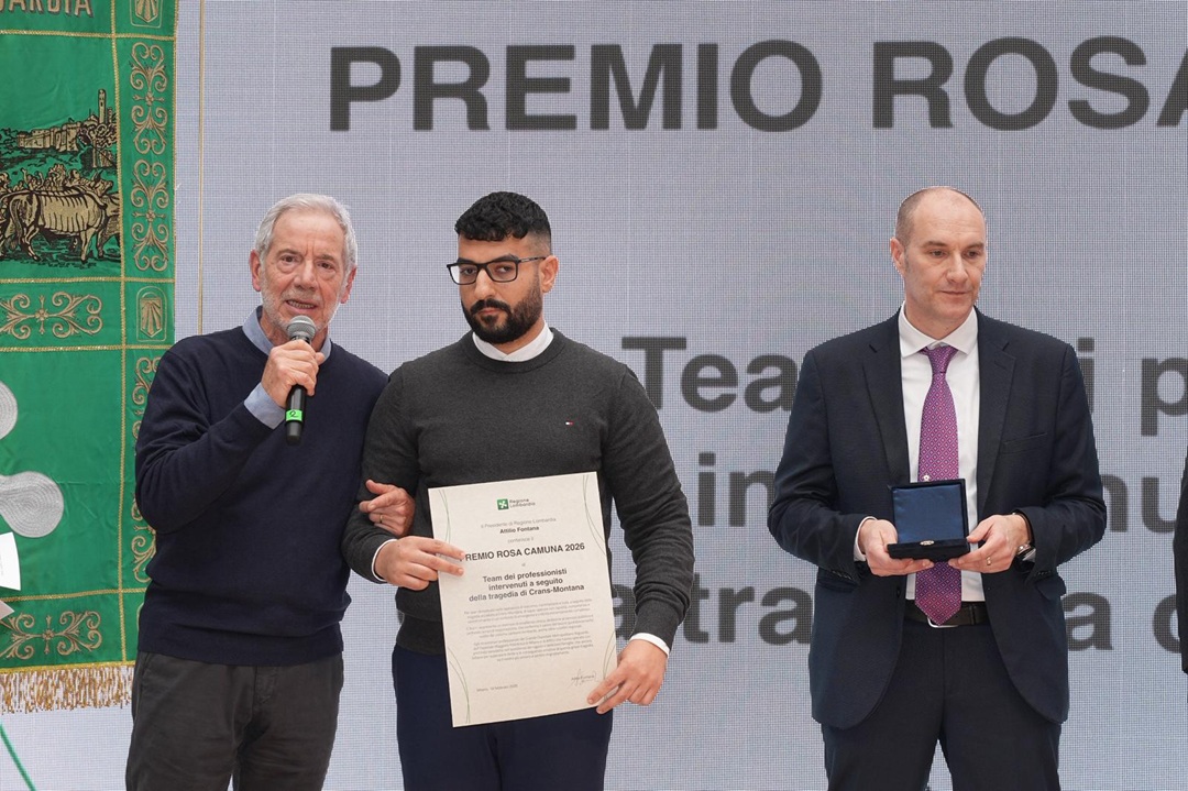 Il presidente della Regione Lombardia, Attilio Fontana, ha consegnato il Premio Rosa Camuna 2026 al team dei professionisti lombardi intervenuti a seguito della tragedia di Crans-Montana.