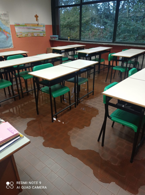 A seguito dell’evento dei giorni scorsi, tre aule della scuola primaria Gramsci sono state oggetto di danni derivanti dal ritorno di acque meteoriche provenienti da canali di gronda. Ancora una volta foglie provenienti dagli alberi nelle vicinanze hanno intasato i canali e provocato un allagamento del solaio di copertura. È da notare che proprio quest’estate era stato eseguito il regolare intervento di ispezione e pulizia. Ciononostante, la straordinaria forza del vento ha causato in brevissimo tempo l’intasamento e le conseguenze già descritte.