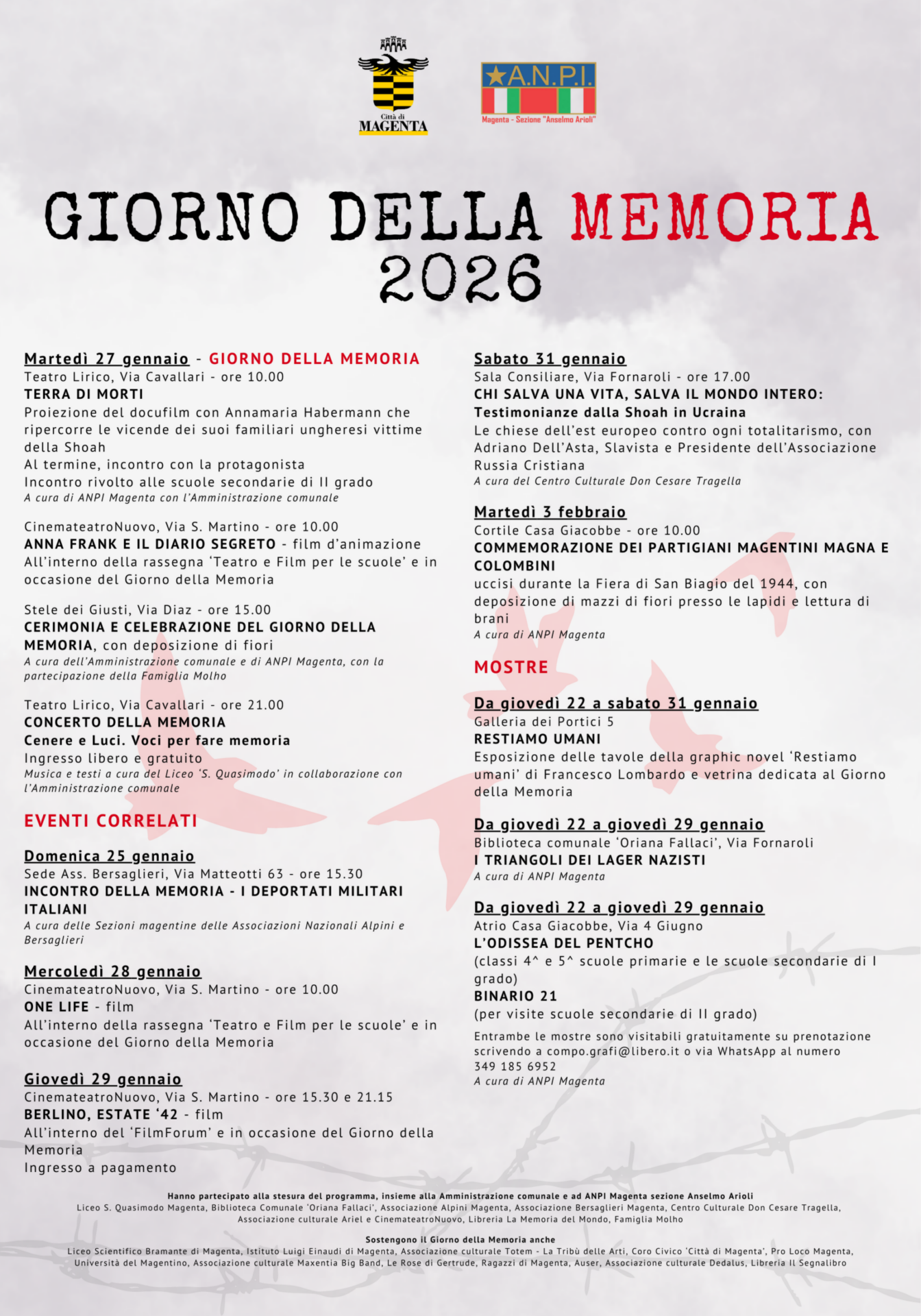 Come ogni anno sono tante le realtà che collaborano con il Comune e ANPI Magenta per la stesura del ricco programma per il Giorno della Memoria con incontri, cerimonie, mostre, convegni e il Concerto della Memoria.