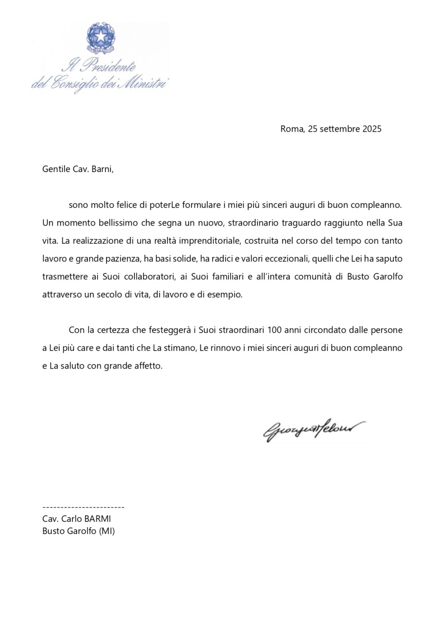 Auguri straordinari per un compleanno straordinario. Sono quelli che il presidente del Consiglio Giorgia Meloni ha inviato a al Cavaliere della Repubblica Carlo Barni, il re degli elettrodomestici, che ha tagliato il traguardo del secolo di vita lo scorso 25 settembre.