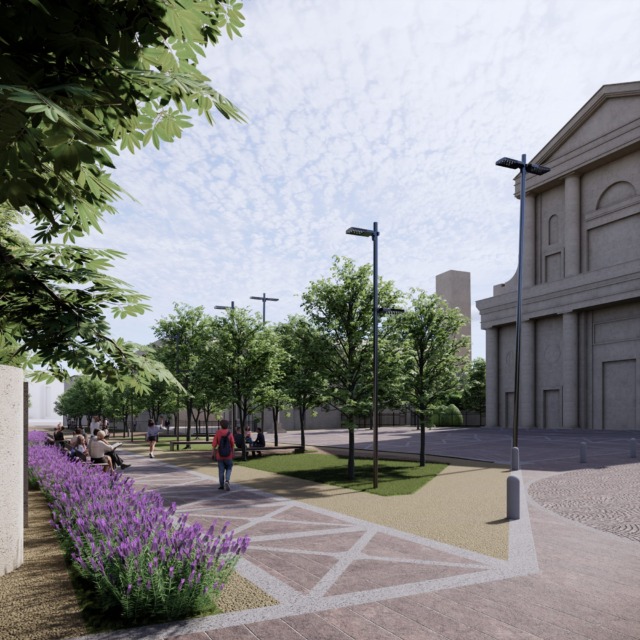 Si prevede un’illuminazione con barre Led integrate nelle panchine, per migliorare la sicurezza e l’atmosfera serale della piazza, valorizzando al contempo l’architettura storica. L’illuminazione sarà distribuita lungo il percorso pedonale, con lampioni di design moderno che aggiungono un elemento estetico all’insieme, oltre a garantire una buona visibilità nelle ore serali.