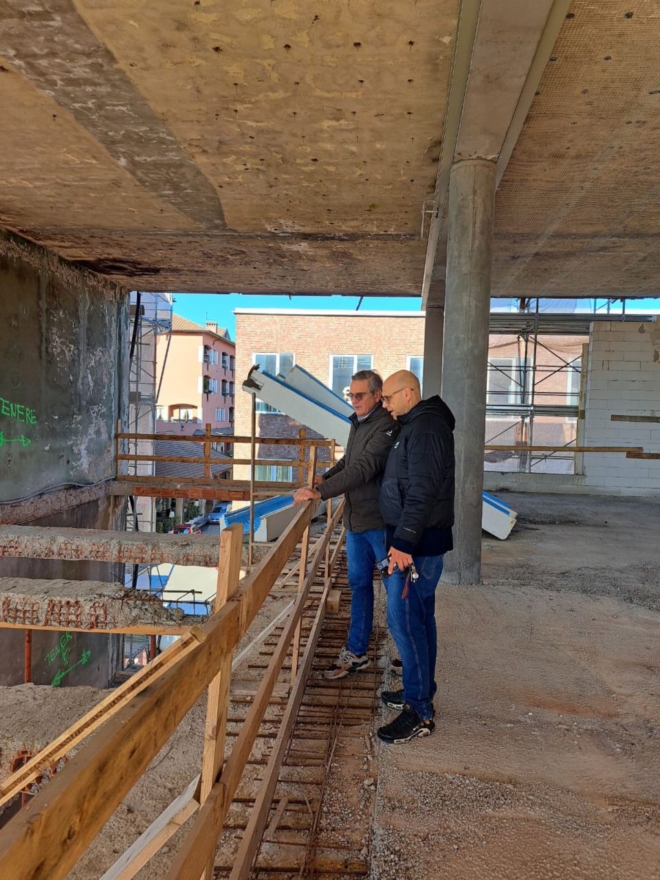 I lavori proseguono con intensità e precisione proseguendo con nuove gettate; rafforzamenti e interventi di rimozione della vecchia struttura. Si intravedono già le scalinate previste dal progetto; la predisposizione alla scala a chiocciola che porta al terrazzamento; l’ingresso verso il parcheggio di via Rosselli e verso la nuova piazza, in fase di definizione.