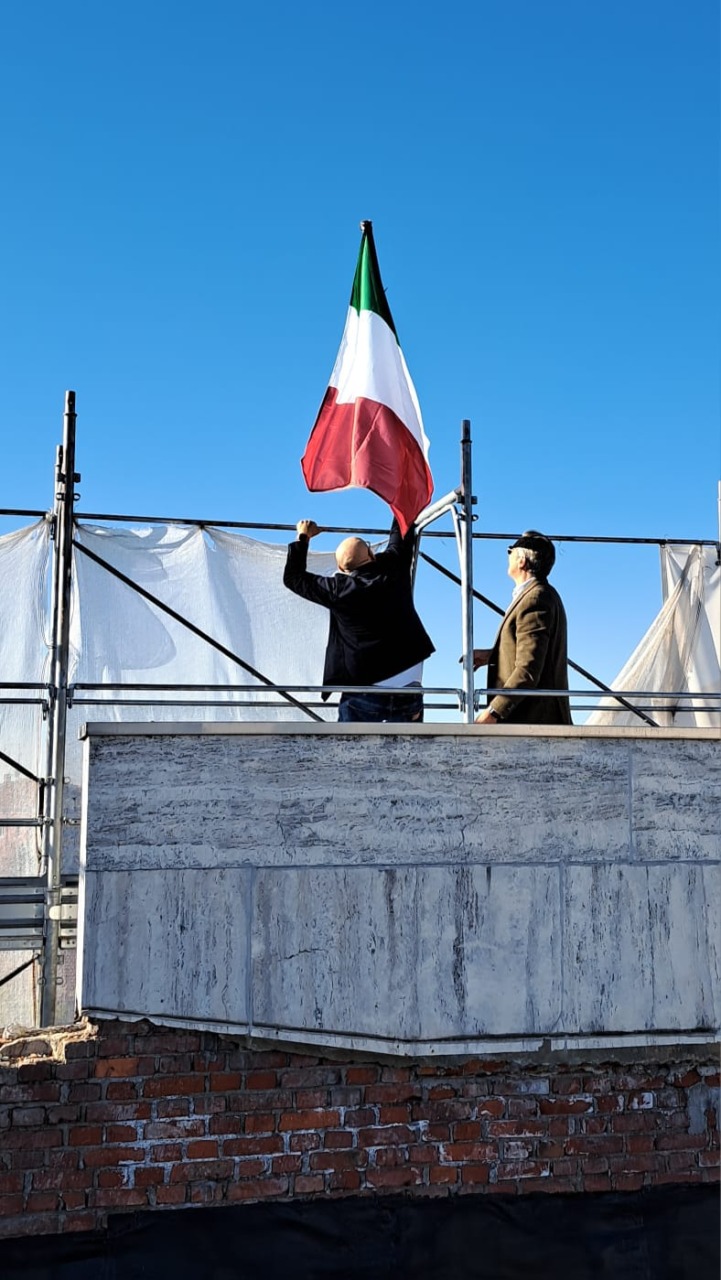 Sul tetto a innalzare la bandiera il sindaco insieme a Cacciati