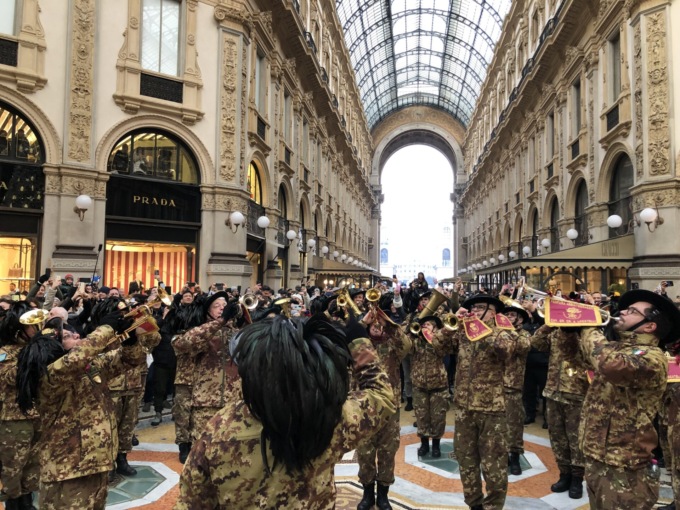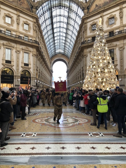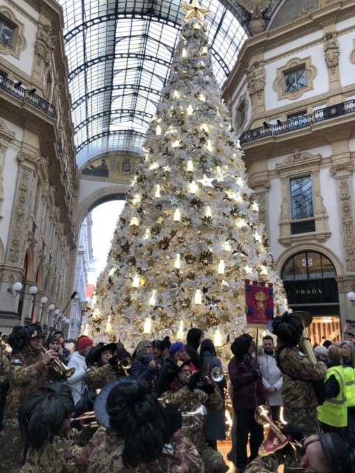 Al termine dell’udienza, la Fanfara ha effettuato un concerto itinerante per le vie del centro adiacenti il Duomo, toccando più punti di rilevante importanza storica e locale, quale piazza Duomo, Palazzo Marino sede del Comune, piazza teatro alla Scala, per poi percorrere la Galleria Vittorio Emanuele e la zona dei mercatini di Natale e finire l’esibizione in piazza San Babila.