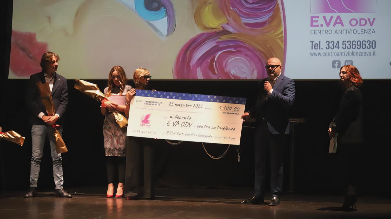 Nel corso della serata, il palco ha ospitato il direttore generale della Bcc di Busto Garolfo e Buguggiate, dottor Roberto Solbiati, chiamato “per un motivo importante”: annunciare un contributo aggiuntivo per E.va ODV.