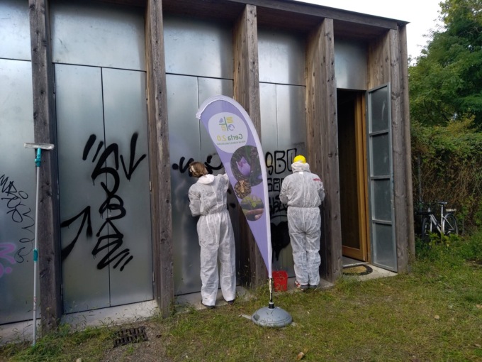 Dalle 9.30 alle 12.30, il gruppo e i volontari hanno pulito il Parco dei Fontanili, cancellato i graffiti su gran parte della struttura che si trova all’entrata dell’area verde e sui cartelli stradali, dipinto un new jersey che delimita l’ingresso. Inoltre hanno lavorato i campi e ricreato un orto presente fino a due anni fa e poi dismesso.