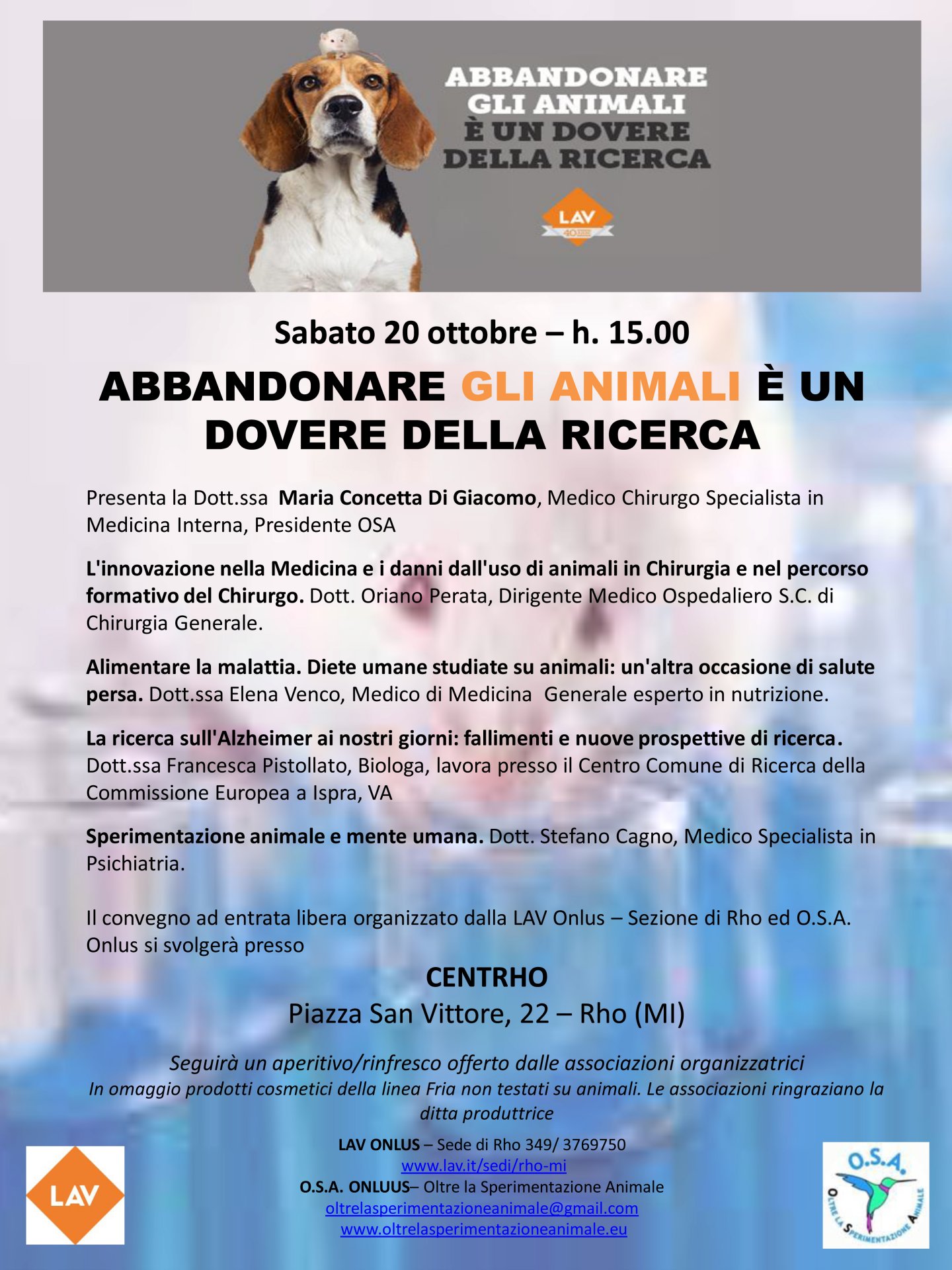 Il 20 ottobre alle ore 15 presso il CentRho in P.zza San Vittore 22 a Rho avrà luogo il Convegno che avrà per tema: “Abbandonare gli animali è un dovere della ricerca”