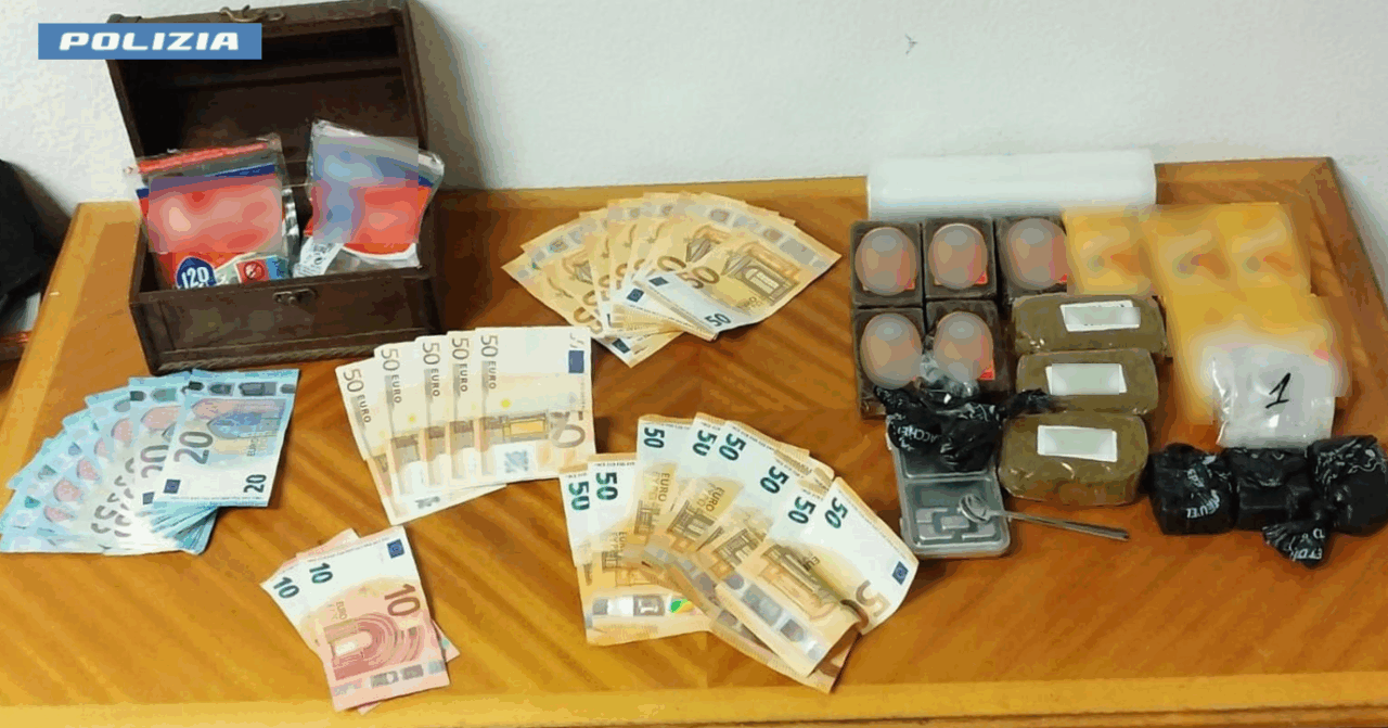 Gli agenti hanno sequestrato un totale di 1.526 grammi di hashish, 28 grammi di cocaina e anche 1.300 euro in contanti.