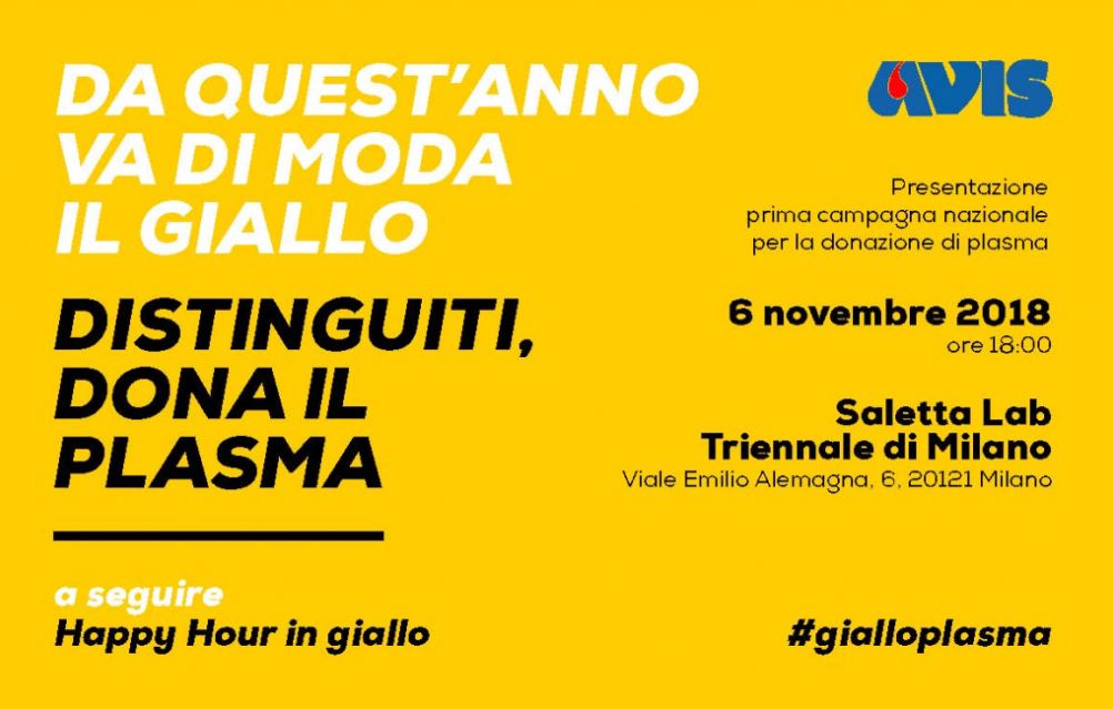 Oggi, martedì 6 novembre 2018, ci sarà la presentazione della campagna nazionale per la donazione di plasma, voluta dall’Avis nazionale. L’appuntamento è alle 18 nella Saletta Lab de La Triennale di Milano di viale Emilio Alemagna. La campagna è stata lanciata sui social con gli hashtag #yellowiscoming e #gialloplasma.