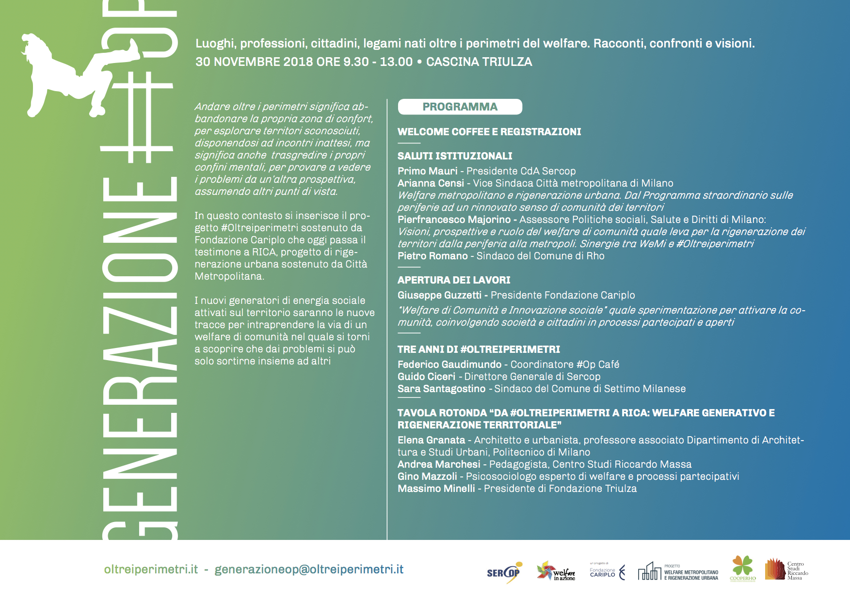 Il prossimo venerdì 30 novembre dalle 9.30 alle 13 in Cascina Triulza ci sarà un evento in cui verranno presentati i risultati del progetto “Generazione #OP, luoghi, professioni, cittadini, legami nati oltre i perimetri del Welfare”.