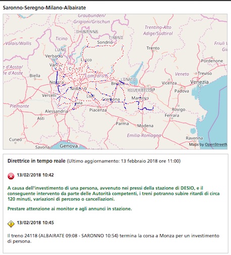 In stazione a Desio è stata investita una persona per questo motivo i treni portando subire ritardi Dino a 120 minuti, variazioni al percorso o cancellazioni.