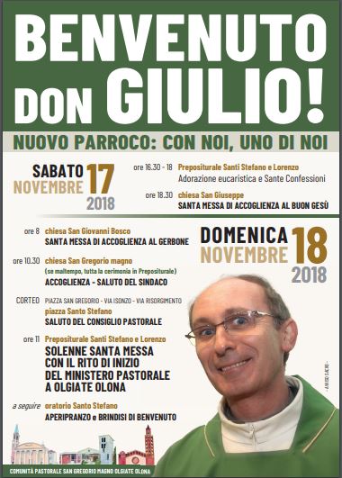 “Sulla locandina che pubblicizza l’inizio del ministero pastorale del nuovo parroco la fotografia che evidenzia il sorriso di don Giulio e l’augurio BENVENUTO DON GIULIO! NUOVO PARROCO: CON NOI, UNO DI NOI sintetizzano il colore e il calore della gente di Olgiate Olona pronta a continuare con gioia e rinnovato vigore il cammino di fede e umano insieme con la nuova guida spirituale inviata dal vescovo, un pastore chiamato nella quotidianità a stare alla testa e al fianco del gregge affidatogli”.