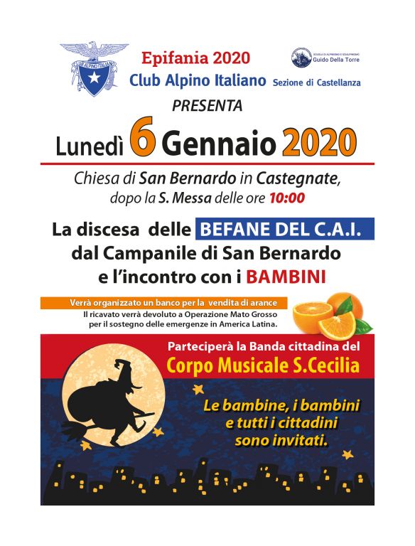 Il CAI sezione di Castellanza presenta lunedì 6 gennaio alla chiesa di San Bernardo in Castegnate, dopo la S. Messa delle 10.00, l’ormai tradizionale “discesa delle Befane” dal campanile della chiesa. Ci sarà anche un incontro con i bambini. Verrà inoltre organizzato un banco per la vendita di arance. Il ricavato sarà devoluto all’associazione Operazione Mato Grosso per il sostegno alle emergenze in America Latina.