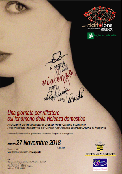 Martedì 27 novembre dalle 10, si terrà un incontro ideato dal Comune di Magenta per riflettere sul menomato della violenza domestica. A moderare l’evento la giornalista di Settegiorni Valentina Pagani. Durante a giornata verrà proiettato il documentario “Una su tre”  di Claudio Bozzatello e verrà presentata anche l’attività del Centro Antiviolenza Telefono Donna di Magenta.