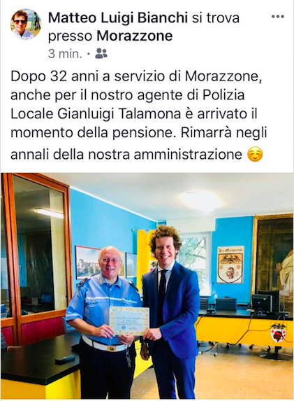 Dopo 32 anni di onorato servizio, Gianluigi Talamona va in pensione. L’agente di Polizia Locale è stato premiato con un riconoscimento alla carriera in città. Il sindaco di Morazzone, l’Onorevole Matteo Luigi Bianchi, ha postato su Facebook la foto della consegna del premio e commenta “Rimarrà negli annali della nostra amministrazione”.