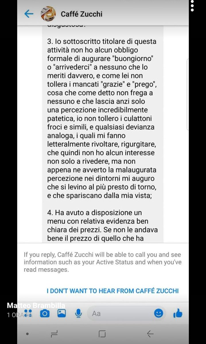 Dopo un aperitivo al “Caffè Zucchi”, nella centralissima piazza San Paolo a Monza, Matteo Brambilla ha pubblicato la sua recensione su Google, come spesso capita tra i consumatori dell’era digitale. La sua opinione, scritta con educazione per quanto critica, non è però piaciuta al proprietario del locale, che ha subito cercato il profilo Facebook del 35enne per insultarlo pesantemente con un messaggio privato. Brambilla, che era entrato nel locale con il suo fidanzato per consumare un aperitivo, ha apprezzato la location, ma nella sua recensione ha fatto notare: “Il cameriere non ha risposto ai nostri saluti o ‘grazie’ quando ci ha servito, e nonostante il bar fosse mezzo vuoto non abbiamo potuto decidere dove sederci e siamo stati schiacciati tra due tavoli già occupati. Inoltre il conto era abbastanza alto per la città in cui eravamo”. Letta la recensione, il titolare non ha perso tempo e ha riservato insulti pesanti al 35enne: “Io non tollero invece i froci e qualsiasi devianza analoga. Non appena ne avverto la malaugurata percezione nei dintorni mi auguro che si levino al più presto di torno”.