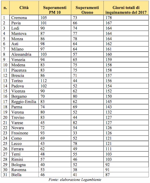 Come detto le Pm10, secondo i dati di Legambiente, lo scorso anno hanno sforato la soglie dei 50 microgrammi per metro cubo 97 volte nella nostra provincia. 64 invece i superamenti dei livelli di ozono. 161 i giorni di inquinamento.