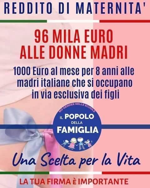 Il Popolo della Famiglia ha depositato presso tutti i municipi della città i moduli per la raccolta firme per la proposta di legge di iniziativa popolare denominata “indennità di maternità” :1000 euro al mese per i primi 8 anni di vita del figlio, trasformato in vitalizio alla nascita del 4° figlio o nel caso di nascita di un figlio disabile. La proposta di legge ha come obiettivo quello di curare la piaga della denatalità.