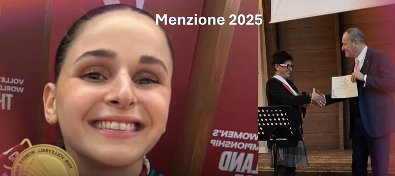 Menzione per Benedetta Sartori, campione del mondo con le azzurre del volley, “per gli straordinari successi sportivi e il titolo di campionessa del mondo con le azzurre del volley. Esempio di impegno, passione e determinazione, orgoglio per Nerviano e ispirazione per le nuove generazioni”.