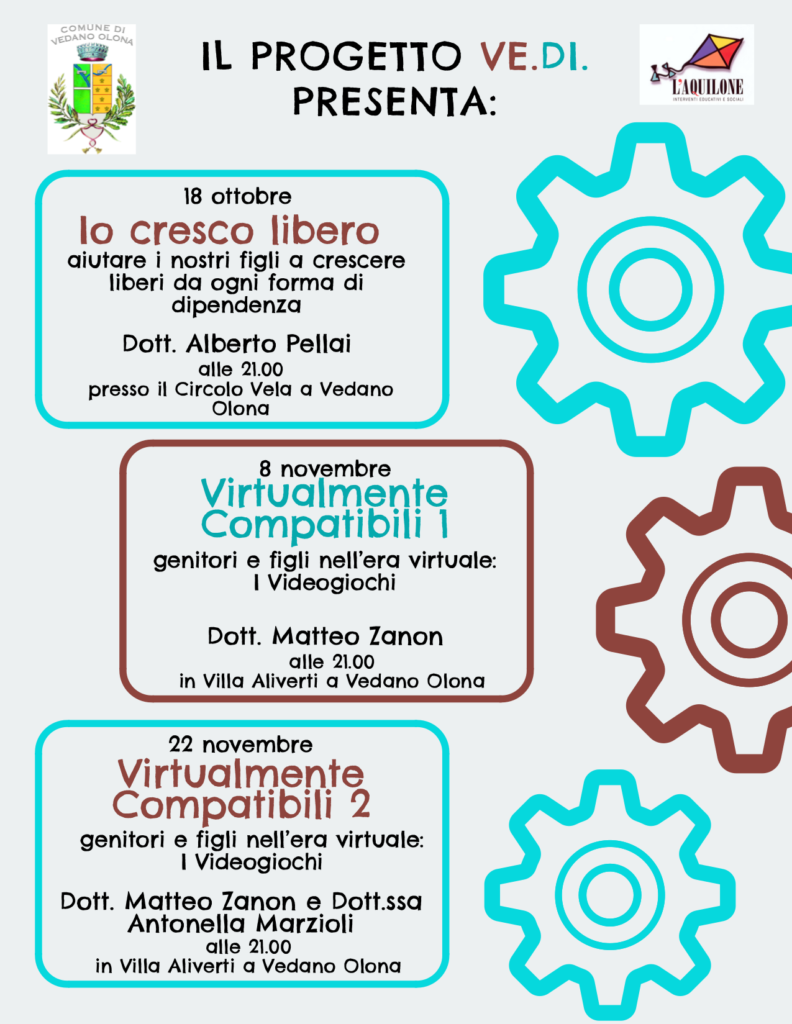Giovedì 18 ottobre, alle ore 21 al Circolo Vela in via Don Minzoni 2 a Vedano Olona, inizia il ciclo di incontri pedagogici promosso dal Comune di Vedano Olona e dalla cooperativa l’Aquilone nell’ambito del progetto Ve.Di. Il primo appuntamento dal titolo “Io cresco libero” sarà tenuto dal Dott. Albero Pellai, noto psicoterapeuta dell’età evolutiva. Sarà dedicato al rischio “dipendenza”