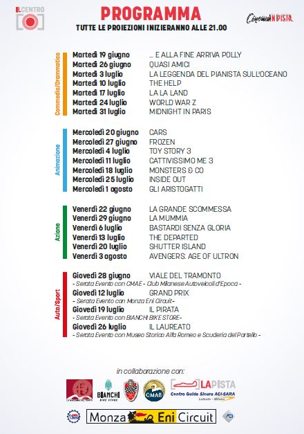 film riservati a tutti gli appassionati di sport e motori che, in più, avranno il privilegio di ammirare alcuni modelli della iconica Alfa Romeo Duetto protagonista del film Il Laureato che verrà proiettato per l’occasione. Ogni giovedì inoltre saranno organizzati eventi a tema in collaborazione con Cmae – Club Milanese Automotoveicoli d’epoca, Monza Eni Circuit Autodromo di Monza, Bianchi Bike Store, il Museo Storico Alfa Romeo e Scuderia del Portello.