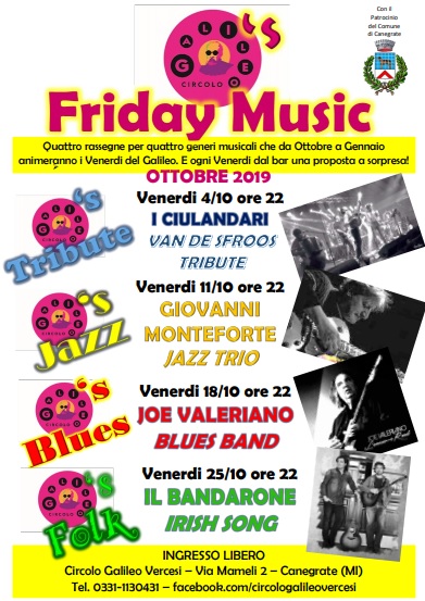 Prenderà il via questa sera, venerdì 4 0ttobre 2019, la rassegna “Galileo’s Friday Music”, concerti serali durante i quali si esibiranno numerosi artisti provenienti da diverse esperienze musicali, dal jazz al blues, dal folk alla riproposizione di repertori di gruppi e cantanti famosi.