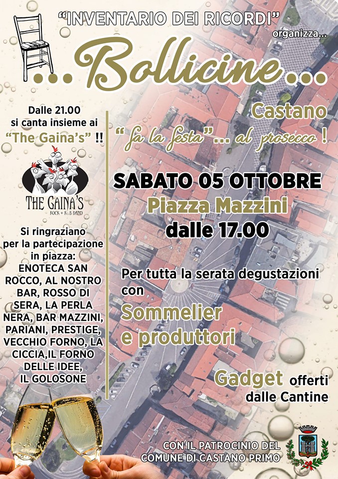 L’associazione “Inventario dei Ricordi”, con il patrocinio del Comune di Castano, in occasione del “riconoscimento da parte dellUnesco delle ‘Colline del Prosecco’ come Patrimonio Mondiale dell’Umanità, ha deciso che Castano non poteva esimersi dal festeggiare tale evento”. Da qui la decisione di organizzare la Festa “Bollicine”, alla sua prima edizione, che animerà piazza Mazzini sabato 5 ottobre 2019 a partire dalle 17.