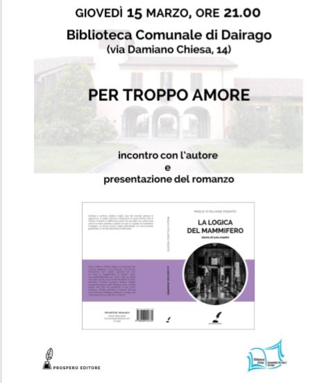 Paolo Vitaliano Pizzato – autore e gestore del blog ilconsigliereletterario.com – presenterà il suo secondo romanzo “La logica del mammifero – Storia di una madre”. Protagonisti del racconto sono Lorenzo e sua madre Clarissa, la cui vita apparentemente normale nasconde “vissuti terribili fatti di miseria”.