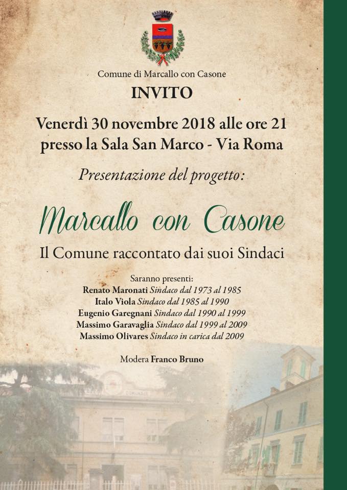 “Marcallo con Casone. Il Comune raccontato dai suoi Sindaci”. Questo il titolo del volume che verrà presentato la sera di domani, venerdì 30 novembre, al centro polifunzionale San Marco di via Roma a Marcallo. L’iniziativa editoriale è stata resa possibile da un progetto di alternanza scuola-lavoro che ha coinvolto un gruppo di studenti dei licei Bramante e Quasimodo di Magenta. I ragazzi, coordinati dai dipendenti comunali, si sono calati nella parte dei “topi di biblioteca”, e hanno cercato di ricostruire gli eventi più importanti che hanno caratterizzato l’operato delle varie Amministrazioni comunali succedutesi dal 1946 ad oggi.