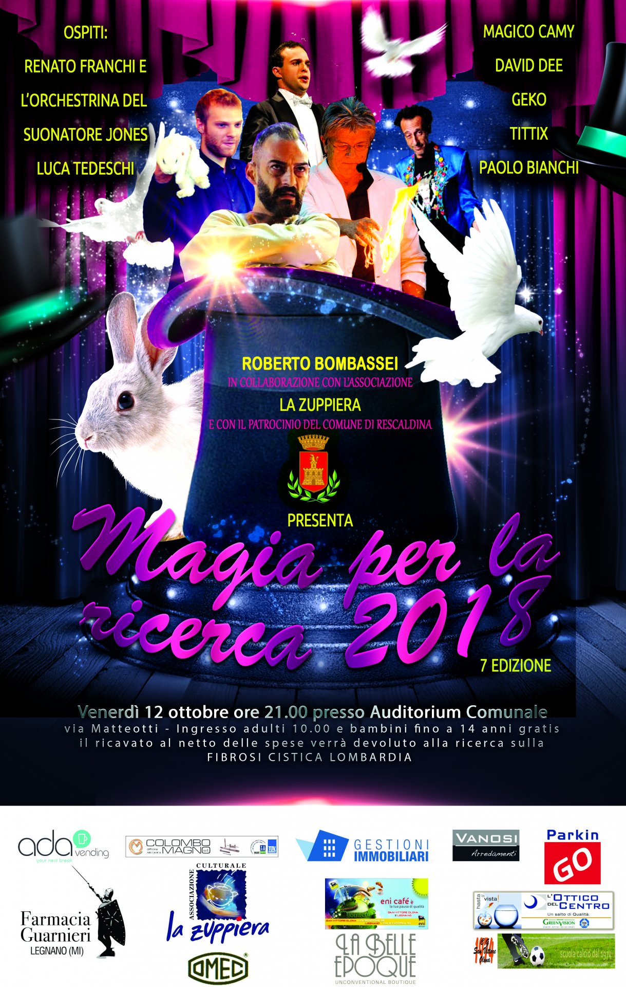 Sul palco dell’Auditorium insieme a Roberto Bombassei, in collaborazione con l’Associazione La Zuppiera e con il patrocinio del Comune di Rescaldina ci saranno alcuni dei migliori artisti magici italiani: Magico Camy e le sue meraviglie, l’escape artist David Dee, il nuovo Houdini, il giovanissimo Geko e le sue grandi illusioni, l’artista poliedrico Tittix e il cabaret magico di Paolo Bianchi. Come ospiti Renato Franchi e la orchestrina del suonatore Jones e l’incredibile voce di Luca Tedeschi.