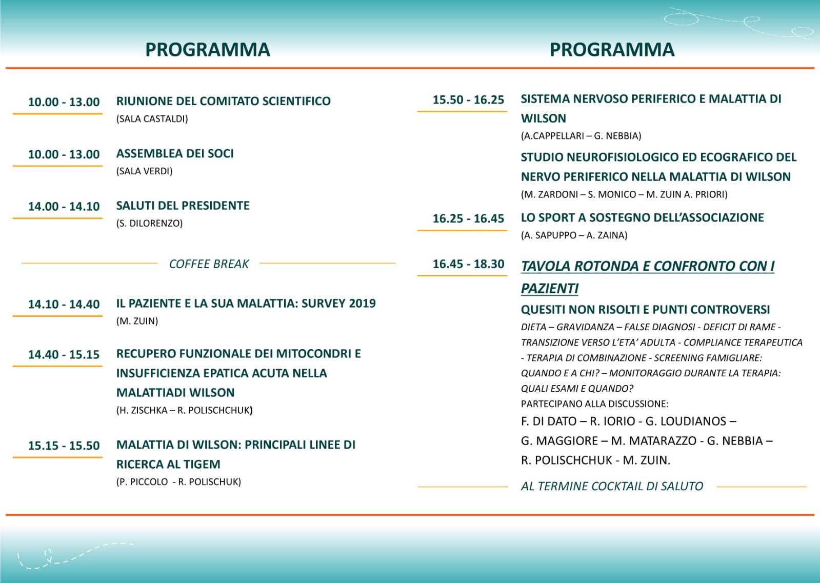 Il convegno si terrà sabato 30 novembre 2019 dalle 14.30 all’Hotel Westin Palace di Milano e sarà intitolato “Mondo Wilson”. Gode del patrocinio dell’Istituto Superiore di Sanità, della Fondazione Telethon, di Regione Lombardia e del Comune di Milano e saranno presenti specialisti e ricercatori di fama internazionale per questa patologia.