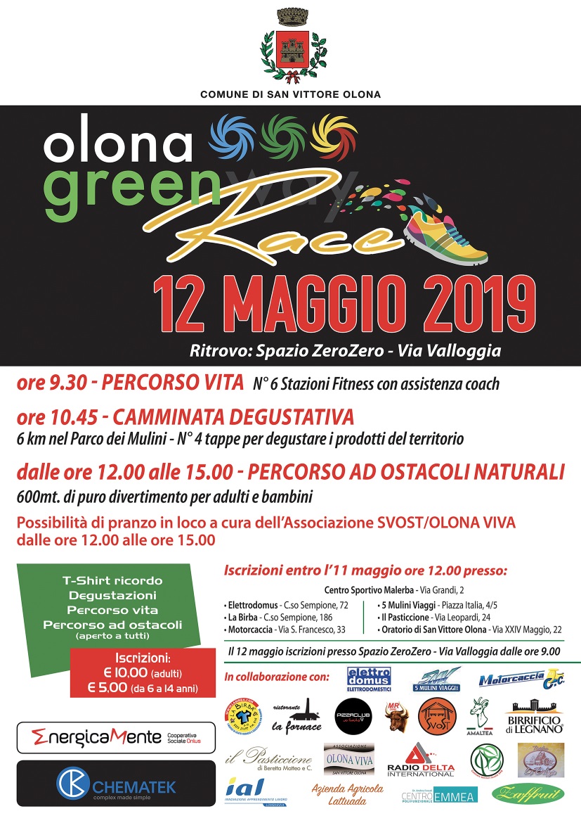 L’Olona Green Race si terrà domenica 12 maggio 2019 allo “Spaziozerozero” in via Valloggia a partire dalle 9.30 previa iscrizione dove, ricordano dal Comune “con il contributo di 10 euro, i partecipanti riceveranno: la maglietta dell’evento, una sacca gara Olona Green Race, degustazioni gratuite presso le quattro tappe ristoro. L’adesione all’evento consentirà indistintamente di partecipare sia al percorso vita, sia alla camminata degustativa a passo libero, per 6 km lungo l’Olona Green Way, e al percorso ad ostacoli di circa 1 km all’interno del Vallo”.