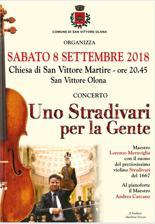 “Uno Stradivari per la gente”. Questo il titolo della serata in programma sabato 8 settembre, nella chiesa parrocchiale. Organizza il Comune di S.Vittore Olona. Protagonisti saranno il maestro Lorenzo Meraviglia e il violino Antonio Stradivari del 1667 (assicurato per 10 milioni di euro, appartiene a un importante collezionista americano che ne concede l’uso al maestro per la sua attività concertistica).