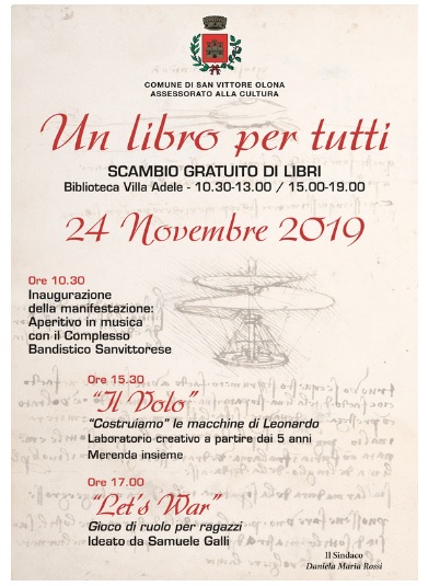 Alle 10.30 inaugurazione con aperitivo in musica sulle notte del Complesso bandistico sanvittorese, poi via allo scambio di libri nel seminterrato della biblioteca; alle 15.30 laboratorio creativo per bambini dai 5 anni “Il volo-Costruiamo le macchine di Leonardo” con tanto di attori in abiti di scena dell’epoca e merenda insieme, alle 17 “Let’s War”, gioco di ruolo, ideato da Samuele Galli.