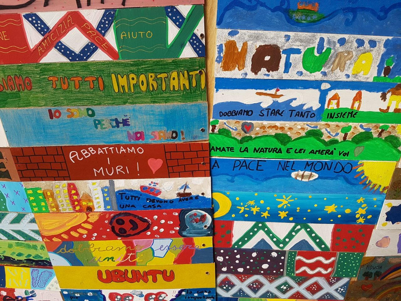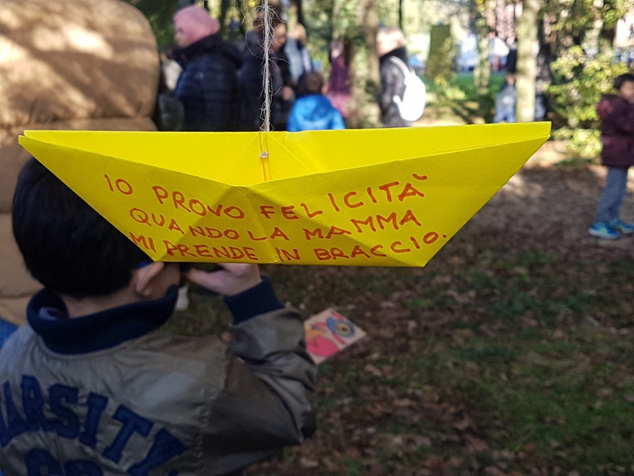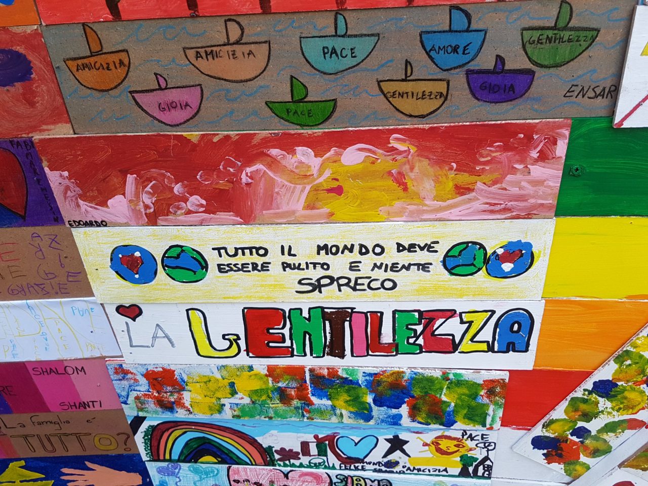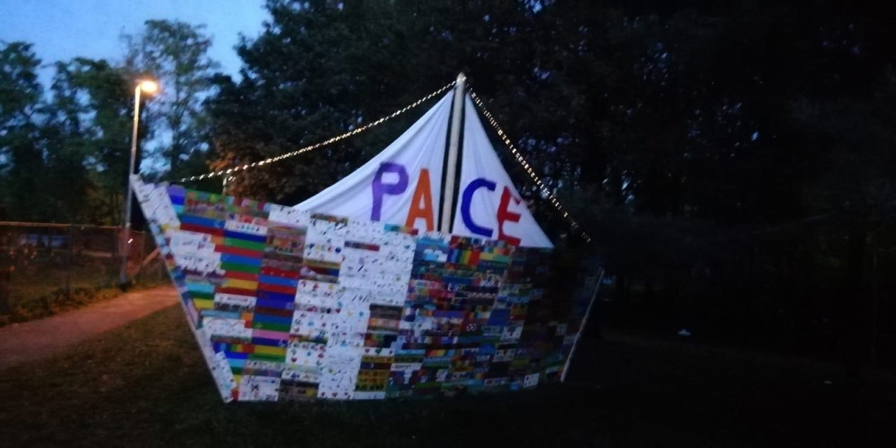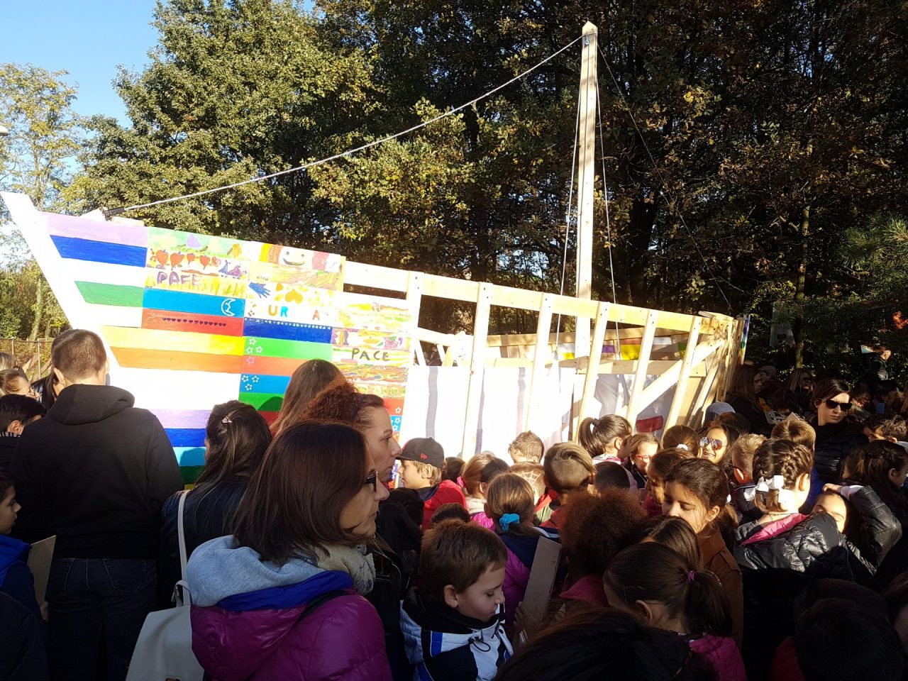 Sabato 9 novembre, tutti i bambini, circa 800, accompagnati dai loro genitori, hanno ricoperto il telaio dell’imbarcazione con delle strisce di compensato, arricchite da un messaggio di fratellanza, e hanno appeso sugli alberi circostanti tante barchette di carta. Sulle vele, illuminate da due fili di luci, una parola spicca a grandi lettere: pace.