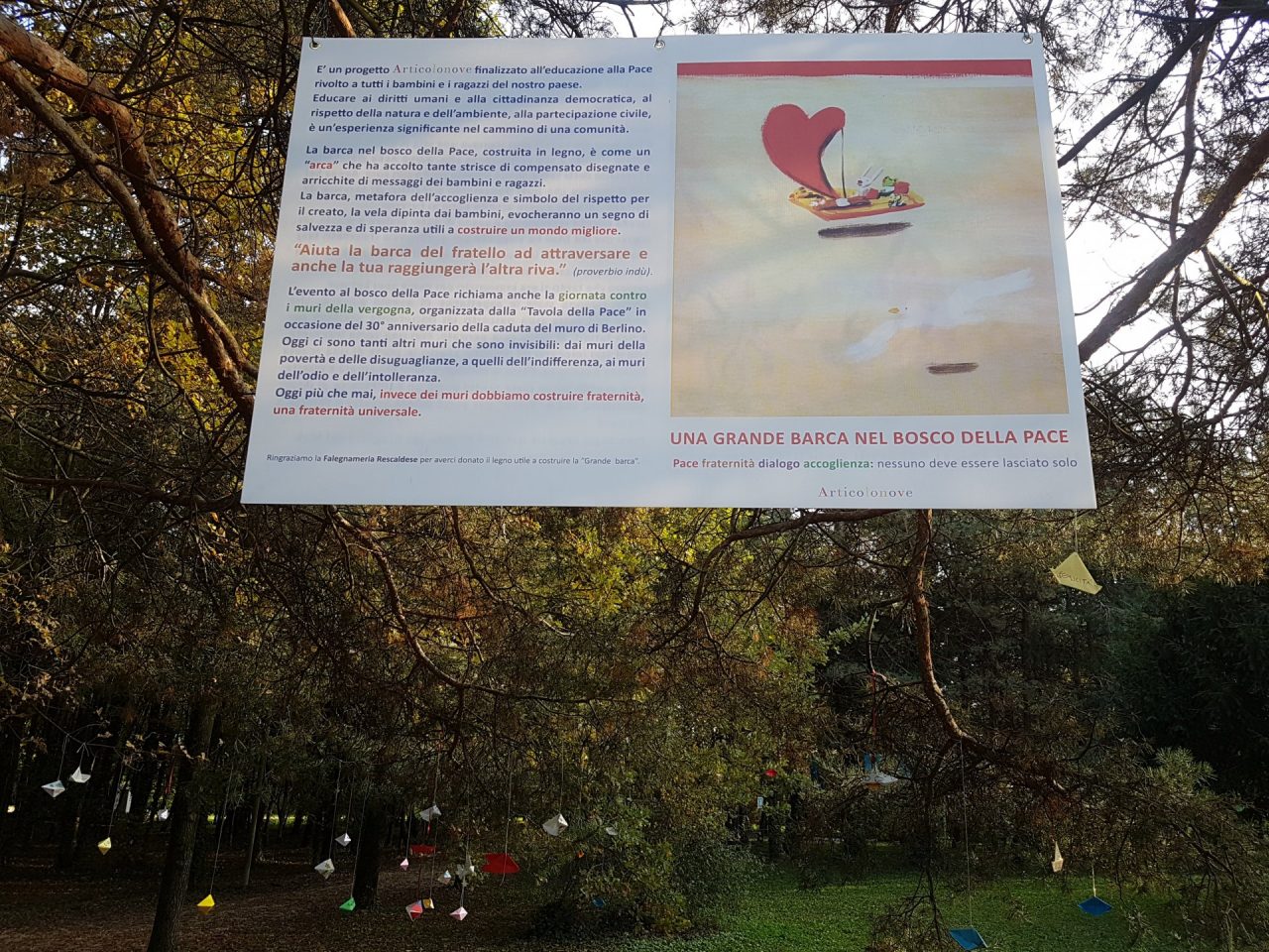 Una grande barca nel Bosco della Pace: 800 bambini, sabato 9 novembre, accompagnati dai loro genitori, hanno ricoperto il telaio dell’imbarcazione con delle strisce di compensato, arricchite da un messaggio di fratellanza.