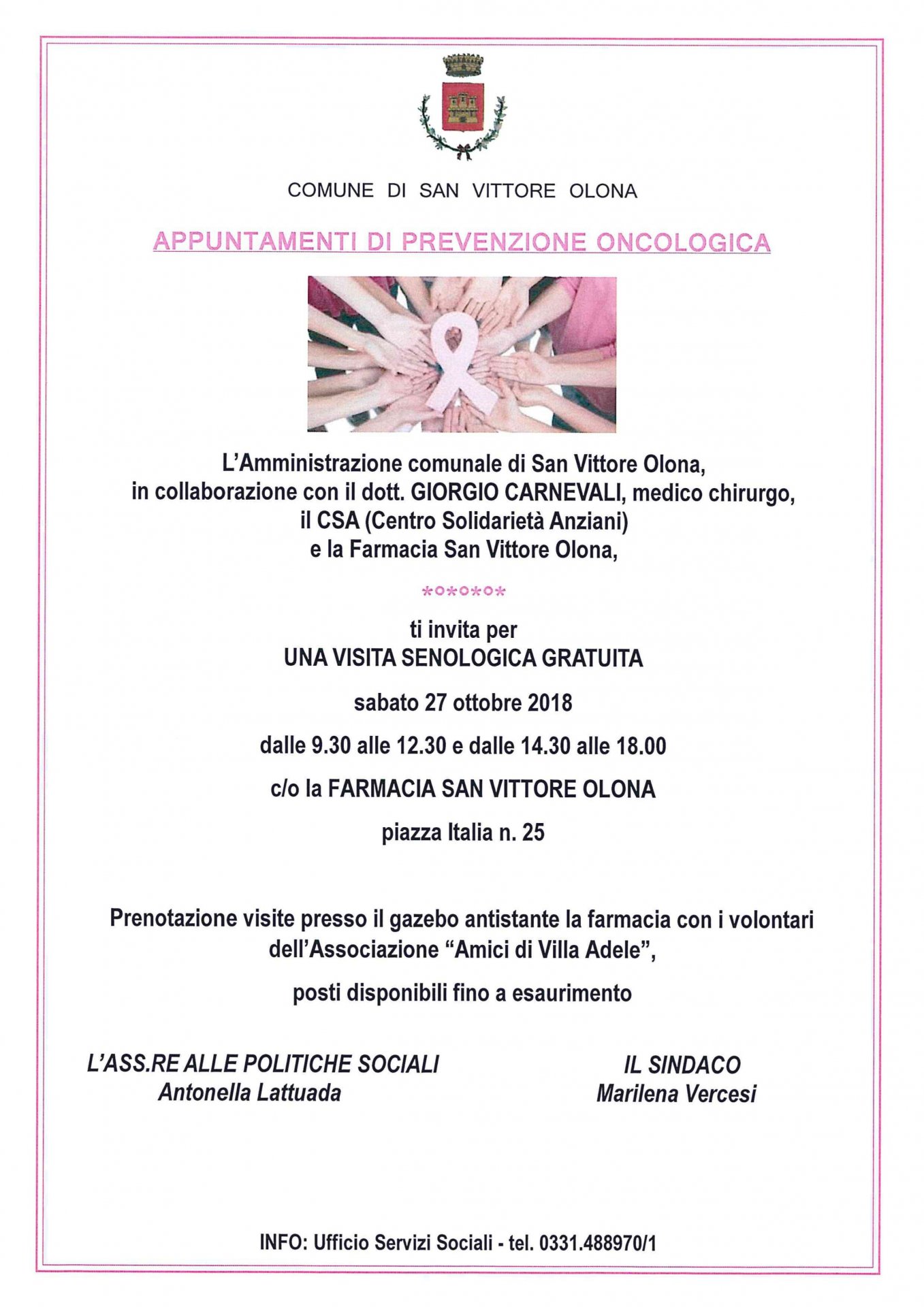 “Informazione, sensibilizzazione e prevenzione delle patologie oncologiche femminili sono ormai da anni i nostri obiettivi in ambito socio-sanitario – afferma il sindaco Marilena Vercesi -. Anche quest’anno, grazie alla disponibilità della farmacia e professionalità di Carnevali, daremo continuità alle visite gratuite di screening perchè, se da un lato, le diagnosi statisticamente sono in aumento è con la prevenzione che oggi si guarisce di più”.