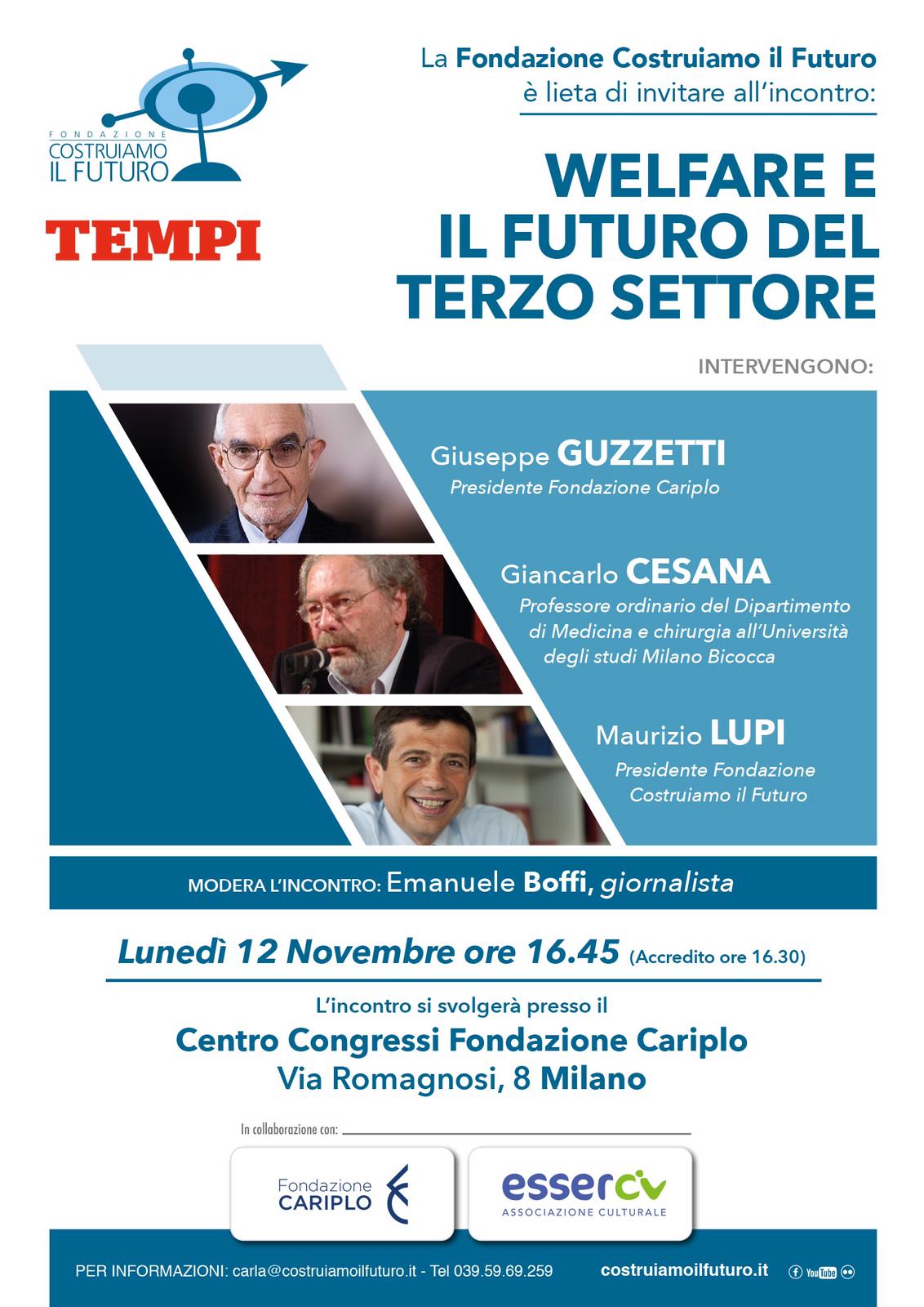 Lunedì 12 novembre alle 16.45 si terrà a Milano, al Centro Congressi Cariplo di via Romagnosi, il congresso “Welfare e il futuro del terzo settore”. L’incontro è organizzato da Fondazione Costruiamo il Futuro e Tempi in collaborazione con Fondazione Cariplo e Associazione culturale Esserci. Durante il convegno interverranno Giuseppe Guzzetti, presidente Fondazione Cariplo, Giancarlo Cesana, professore ordinario del Dipartimento di Medicina e chirurgia all’università degli Studi Milano Bicocca e Maurizio Lupi, presidente della Fondazione Costruiamo il Futuro.