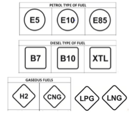 Il quadrato simboleggerà i gasoli. La sigla XTL indicherà il gasolio sintetico, ovvero non derivato dal greggio. La lettera B precederà la cifra indicante la percentuale di biodiesel presente nel gasolio. Dunque B7 biodiesel al 7%, B10 biodiesel al 10%  e B100 puro biodiesel.