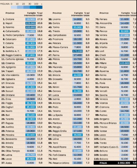 Le prime dieci posizioni in classifica, ovvero i territori dove il reddito di cittadinanza avrà un “peso specifico” maggiore, sono tutti al sud. Di contrasto gli “ultimi”, tra i quali ci siamo anche noi milanesi, sono tutti al nord. “Queste cifre – sottolinea il quotidiano economico – vanno rapportate agli abitanti. Se a Napoli e Palermo l’incidenza supera il ­20% delle famiglie residenti, a Torino e Roma è intorno al 9%”. In pratica se prendiamo 100 le famiglie con i requisiti d’ammissione, 48,6 sono al Sud e nelle Isole, 19 al centro e 32,4 al Nord.