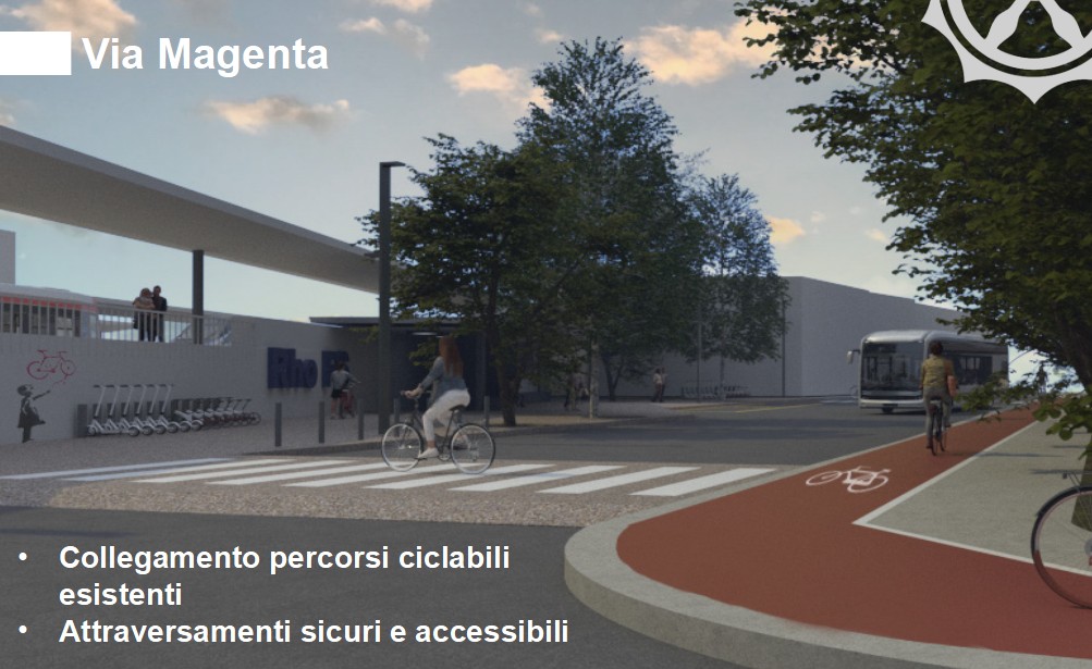 Il progetto ‘Bosco elettrico – Multimodalità e spazio pubblico a Rho’, presentato dal Comune di Rho, e finanziato interamente dal bando con 4.579.350 euro, prevede di potenziare l’intermodalità della stazione, privilegiando il Tpl (trasporto pubblico locale) e tutte le forme di accessibilità alternativa al trasporto privato come taxi, car sharing, biciclette. È inoltre prevista la riqualificazione della piazza principale a nord della stazione, con la creazione di uno spazio pubblico multifunzionale (‘Bosco elettrico’) e il ridisegno della piazza nei suoi spazi dedicati ai pedoni e alla riorganizzazione delle aree kiss&ride (sosta veloce per auto) e Tpl. Il progetto include anche la riqualificazione delle rampe di accesso al sottopasso pedonale passante e un nuovo anello ciclabile di collegamento con il centro di Rho, la stazione e la piazza del Municipio.