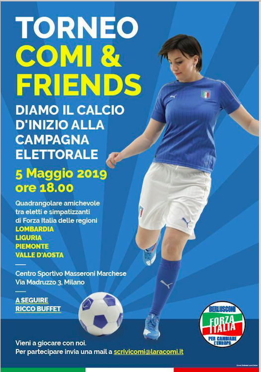 Per la campagna elettorale Forza Italia ha deciso di partire in modo sportivo: con un quadrangolare amichevole tra eletti e simpatizzati del partito delle regioni di Lombardia, Liguria, Piemonte e Valle D’Aosta. Il torneo “Comi & Friends” si terrà domenica 5 maggio 2019 alle 18 al Centro Sportivo Masseroni Marchese di via Madruzzo a Milano. Dopo il torneo ci sarò un ricco buffet. Per partecipare è sufficiente mandare una mail a scrivicomi@laracomi.it