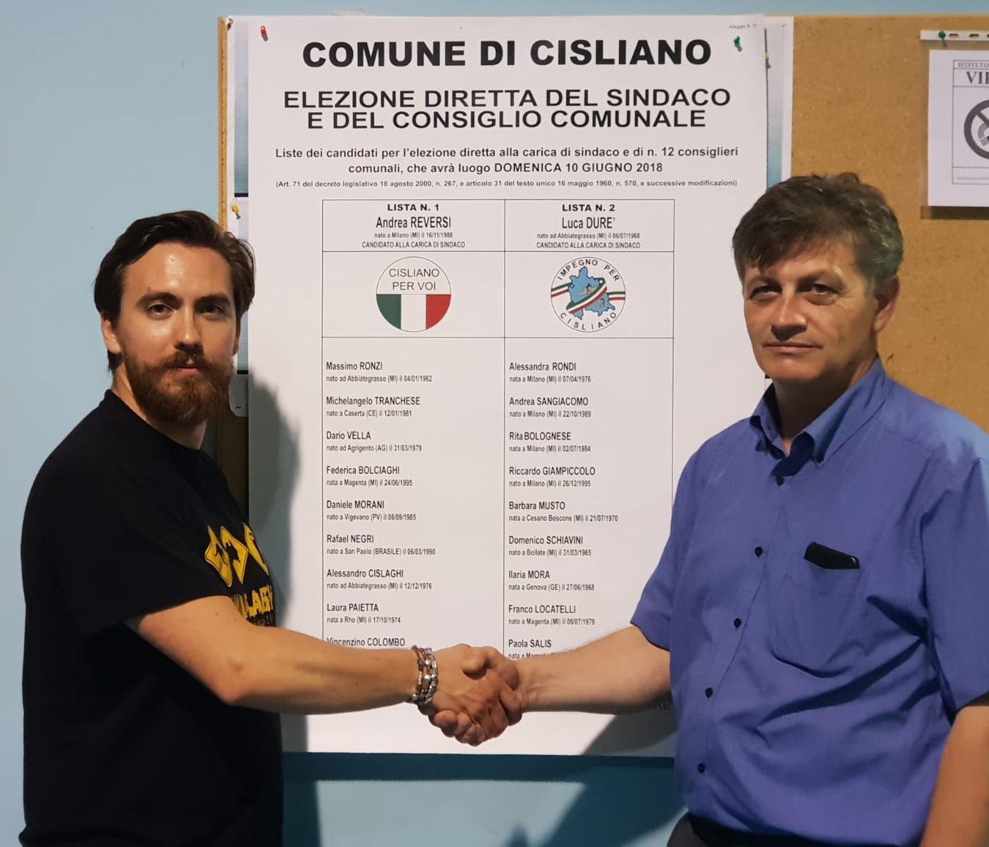 Elezioni a Cisliano: stretta di mano tra Andrea Reversi e Luca Durè