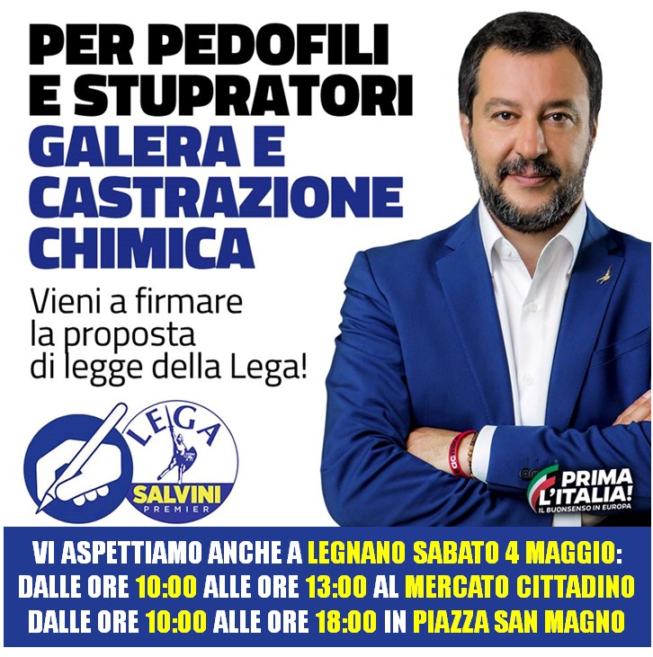 Domani, sabato 4 maggio 2019, dalle 10 alle 13 al mercato cittadino e dalle 10 alle 18 in piazza San Magno, ci sarà la raccolta firme a sostegno della proposta avanzata dalla Lega per introdurre la castrazione chimica per pedofili e stupratori. “La nostra tolleranza zero si concretizza in proposte di legge come questa: pene esemplari per reati infami”. Sarà anche un occasione di confronto costruttivo con i cittadini in merito ai progetti che coinvolgono Legnano.