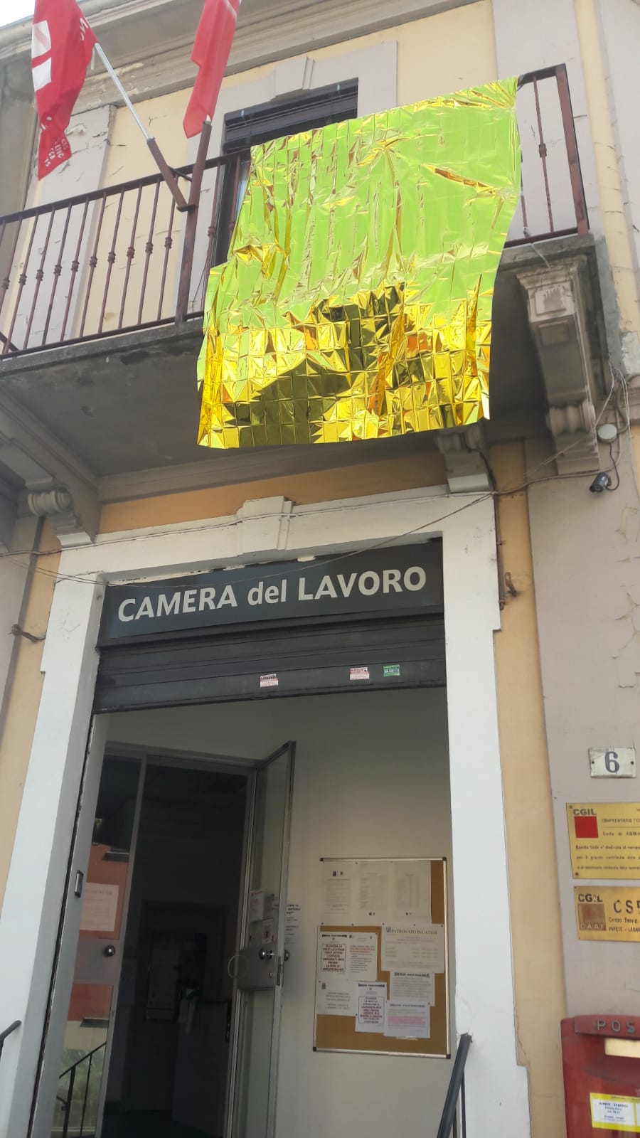 Coperta termica, a indicare la disponibilità ad accogliere, esposta fuori dalla sede in occasione della Giornata Mondiale del Rifugiato.