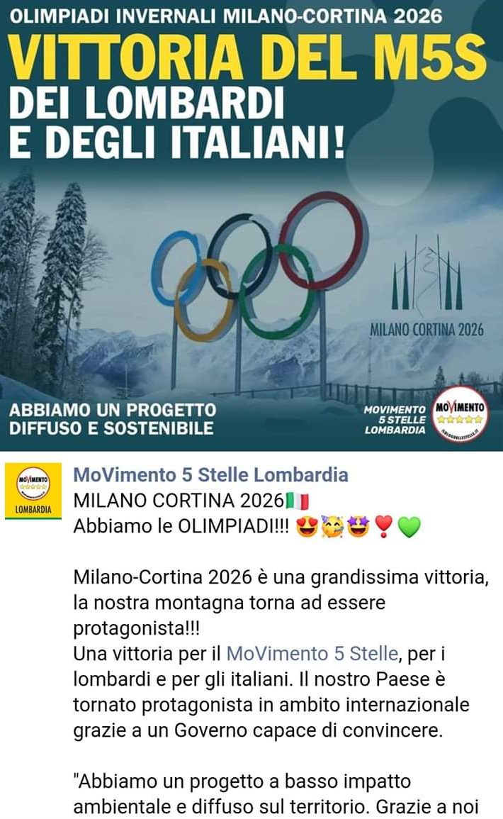 Cortocircuito nella comunicazione del Movimento 5 Stelle Lombardia, che dopo l’assegnazione delle Olimpiadi Invernali 2026 a Milano-Cortina rivendica la vittoria su Facebook.
