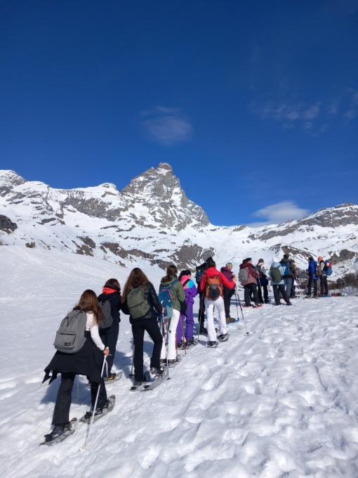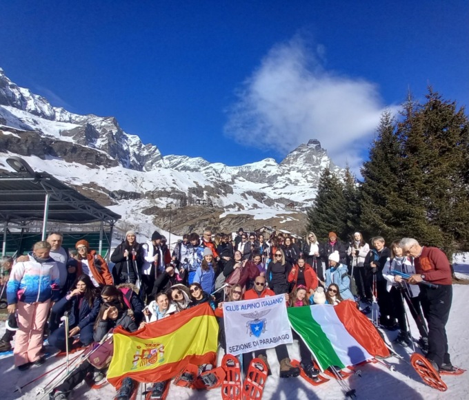Tutto il gruppo CAI di Parabiago ha organizzato una gita con ciaspole nel comprensorio di Valtournenche/Cervinia con la partecipazione del gruppo scambio Erasmus con una scuola spagnola. Durante la ciaspolata gli accompagnatori Roberto ed Enrico hanno fatto partecipare un allievo con